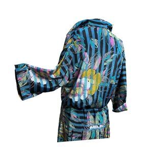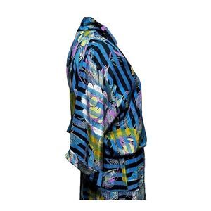 Janet vintage stretchy cinched empire waist midi with collared v neckline ties at the bottom with soft and oversized 3/4 sleeves neatly rolled at cuffs. Teal and black stripes with beautiful splashes of pink and yellow floral patterns throughout. Made with gorgeous, silky, lightweight fabric giving pleated bottom extra swing.