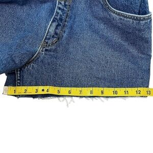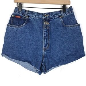 Shorts are in good pre-owned condition. Ultra high waist. Bling embellishments. Raw hem can be cuffed. Front zipper with single button closure. Vintage sizing is different from modern sizing. Please refer to measurements to ensure proper fit. See photos for details.