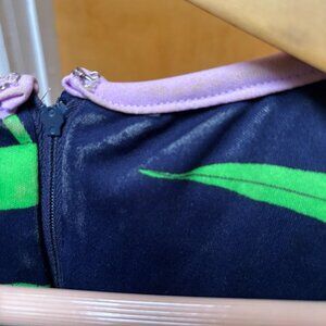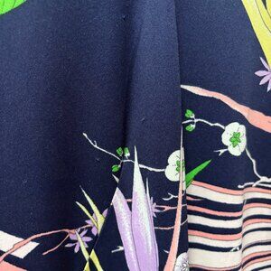 AMAZING Vintage 1970s Jeannene Booher jersey dress. Tropical print in navy, green, pink, purple and yellow. Fun fact: Trina Turk copied this exact print and used it for her line!
