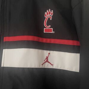 The product is a vintage Jordan Cincinnati Bearcats reversible jacket in adult extra large size, designed for basketball fans and enthusiasts. The jacket features the team's colors of black, red, and white, making it a stylish and practical choice for any season. Made by Nike, this authentic fan apparel is perfect for showing support for the Cincinnati Bearcats in a unique and versatile way.