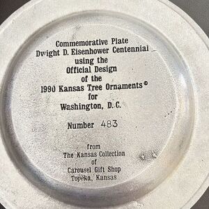 VINTAGE KANSAS EISENHOWER CENTENNIAL 1890 - 1990 COMMEMORATIVE PLATE NUMBER 483 Commemorative Plate Dwight D. Eisenhower Centennial using the Official Design of the 1990 Kansas Tree Ornaments for Washington, D.C Number 483 from The Kansas Collection of Carousel Gift Shop Topeka, Kansas This vintage plate commemorates the Eisenhower Centennial of 1890-1990 and features a unique plate number of 483. Made in the United States and originating from Kansas, this collectible is a wonderful addition to any souvenirs and travel memorabilia collection. The plate is not handmade and is in excellent condition for display. Don't miss the chance to own a piece of history with this one-of-a-kind plate.
