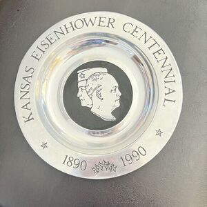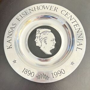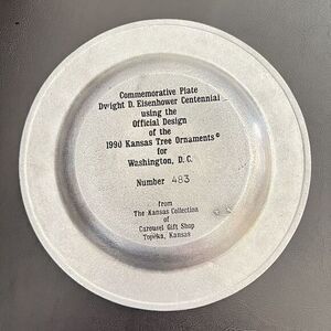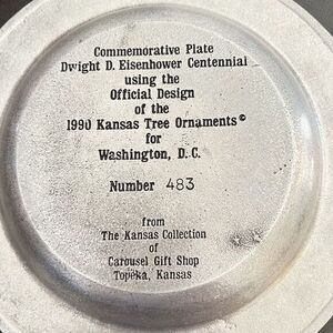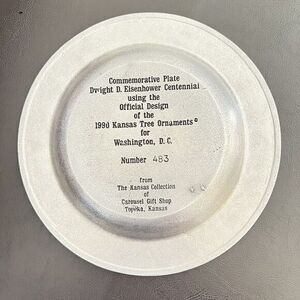 VINTAGE KANSAS EISENHOWER CENTENNIAL 1890 - 1990 COMMEMORATIVE PLATE NUMBER 483 Commemorative Plate Dwight D. Eisenhower Centennial using the Official Design of the 1990 Kansas Tree Ornaments for Washington, D.C Number 483 from The Kansas Collection of Carousel Gift Shop Topeka, Kansas This vintage plate commemorates the Eisenhower Centennial of 1890-1990 and features a unique plate number of 483. Made in the United States and originating from Kansas, this collectible is a wonderful addition to any souvenirs and travel memorabilia collection. The plate is not handmade and is in excellent condition for display. Don't miss the chance to own a piece of history with this one-of-a-kind plate.