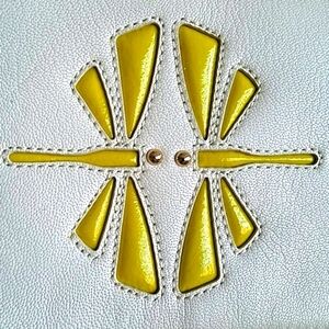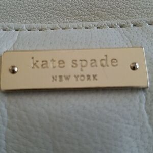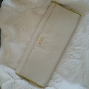 For Kate Spade vintage collectors, handbag white clutch purse with dragonflies on front, absolutely gorgeous bryndis Everglade clotted cream bag no rips, original tag, outside on back slot full length of purse, inside two slots and side pocket with working zipper. Inside is pristine, goldish flaw on inside flap - unable to see when closed. Outside are 2 small areas of discoloration not a dealbreaker, should be able to polish leather if bothers you. Rock this rare bag with character! Yellowish green stylish retro trendy vintage bag