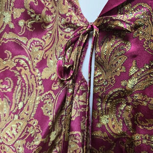 Sleeves:This vintage Kathryn satin dressing gown is a true gem! The colorful robe making it perfect for lounging at home. The robe features a beautiful intricate design in adding a pop of color to your wardrobe. The size is Med/Lg. Despite being vintage, this dressing gown is in great condition, so you can enjoy it for years to come. Whether you're getting ready for a night out or just relaxing at home, this robe is a perfect choice.