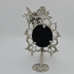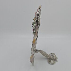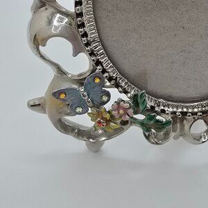 This metal frame has a shiny silver finish with enamel and crystal accents, including a butterfly, dragonfly, flowers, and - of course - a fairy. It is free-standing and the back leg is adjustable. Kirks Folly stamp is on the back.