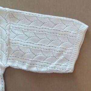 No tags, could be hand knit. Scoop neck and elbow length short sleeves. Nicely done in cream yarn. Fairly smooth (not itchy). Could be a great layering piece for a petite person.