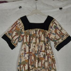 VINTAGE KRIST GUDNASON DRESS EGYPTIAN PATTERN GOLD TRIM MADE IN USA 100% COTTON