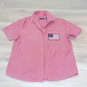 VINTAGE Karen Scott Red STRIPE Short Sleeve STARS Button Down FLAG embroidered