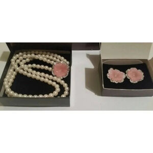 Gorgeous Vintage Designer Signed "Perfect Pansy Collection" From Avon's Kenneth Jay Lane line. This Collections Includes a Necklace and Matching Clip Earrings. The Necklace Consists of Double Strand of Very Large Faux Pearls with a Flower made up of 6 Silver-Tone Petals with 4 Crystals on the Edge of each Petal & Pink Plastic for the Center of the Flower making a Beautiful Pansy. There is a Crystal in the Center of the flower ~25 Crystals on each Pansy. Stamped "K.L.J for Avon" ORIG BOXES!