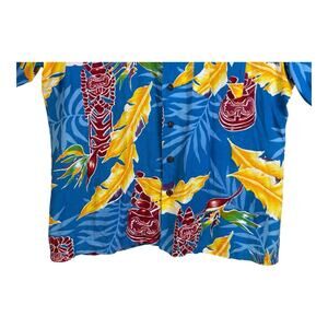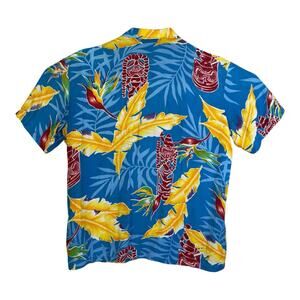 The Vintage Kennington Hawaiian Shirt in men's size Large features a blue palm floral pattern, short sleeves, and a collared neckline with button closure. Made from rayon fabric, this button-up shirt embodies a tropical character and 90s theme, perfect for casual occasions. The regular fit and breathable material make it comfortable and easy to care for, ideal for a beach day or summer outing.
