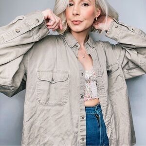 💫 VINTAGE | Khaki Cargo Pocket Detail Oversized Slouchy Cotton Button Down Shirt