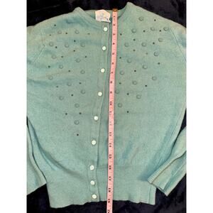 VINTAGE CARDIGAN SWEATER WITH TINY STUDS! MEASUREMENTS IN PHOTOS. I DO NOT THINK THIS IS PURE CASHMERE - IT'S PROBABLY WOOL OR A WOOL/CASHMERE BLEND. EXCELLENT CONDITION (ONE TEENSY MOTH BITE ON BACK - PLEASE SEE CLOSEUP PHOTO).