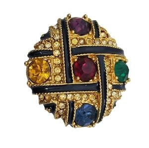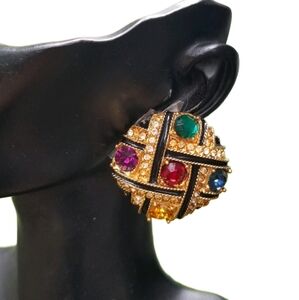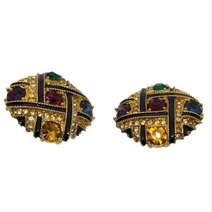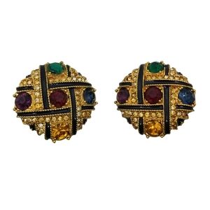 Beautiful large high end byzantine style clip on earrings circa. 1980s. Earrings are goldtone with large faceted jewel color glass stones and little white glass rhinestones. Earrings also have black enamel detail. Earrings measure approx. 1-3/4 inches tall and 1-3/4 inches wide. Beautiful high quality earrings in great condition.
