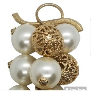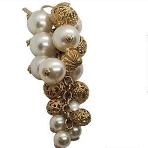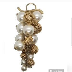 Beautuful vintage statement brooch featuring a long chain clustered with faux pearls and goldtoned filigree design beads that dangles from goldtoned brooch with stick pin closure. Brooch has a sort of cluster of grapes design and measures 4-3/4 inches tall and 1-1/2 inches wide. Brooch is in excellent condition
