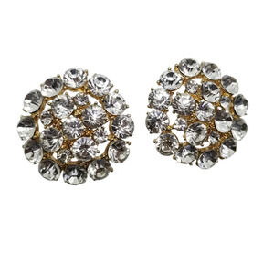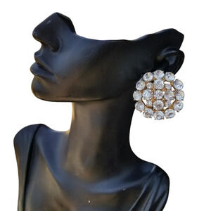 Beautiful vintage goldtone and white glass rhinestone statement earrings. Earrings have a large round design and clip on style backs. Earrings measure approx. 1-3/4 inches in diameter. Excellent condition.