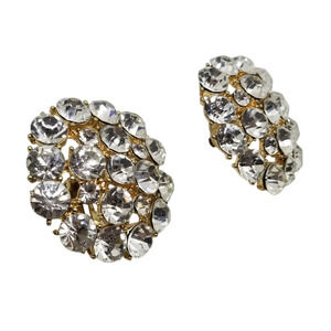 VINTAGE LARGE ROUND GOLDTONED & WHITE RHINESTONES CLIP ON STATEMENT EARRINGS