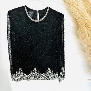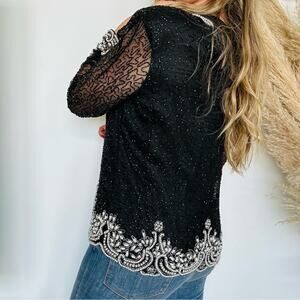 VINTAGE LAURENCE KAZAR Black White Beaded Sequins Bodycon Formal Blouse Shirt L