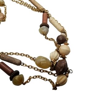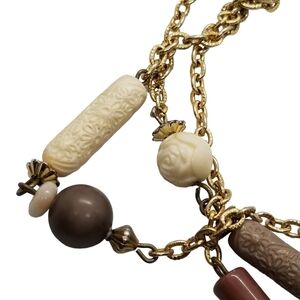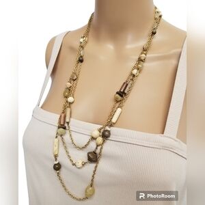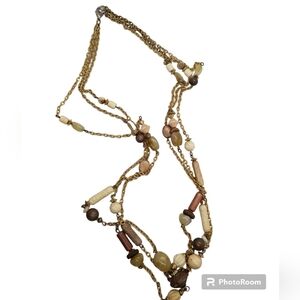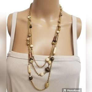 Chic layered necklace made with goldtoned chains and beads of various neutral colors in different shapes, some with floral designs. Beads are made to look like stone, however they are all made of polymer. Necklace has a nice lightweight feel and measures 26 inches in total length.