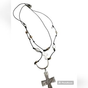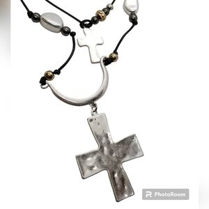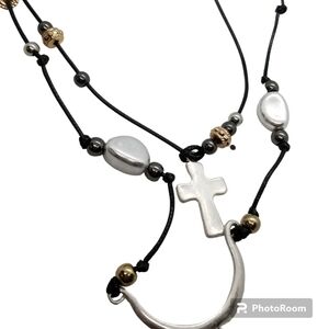 VINTAGE LAYERED SILVERTONED CROSS PENDANT & GOLD/ SILVER BEAD CORD NECKLACE
