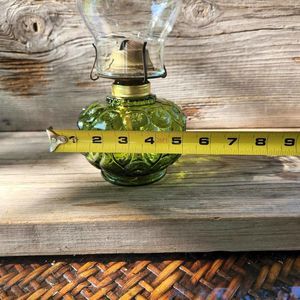 Description: 13" LE Smith Oil Lamp Moss GREEN Moon-Stars Pattern Pressed Glass (wick & chimney), RARE mid century- Avid LESmith Collector Estate A very good-feeling weight, obvious Quality!! (PLEASE SEE PHOTOS IN ZOOM on a bigger screen than a phone)