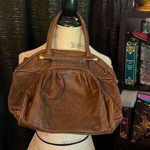 Buttery soft distressed brown leather with vintage /antique look-gold brass accents & unique wrapped leather hand straps secured by a brass pole similar look to ferragamo gancini Marisa satchel.purse /bag/pocketbook