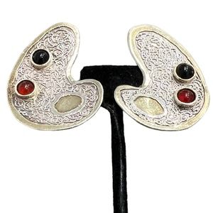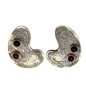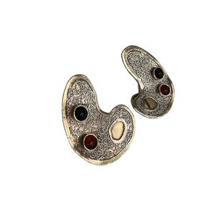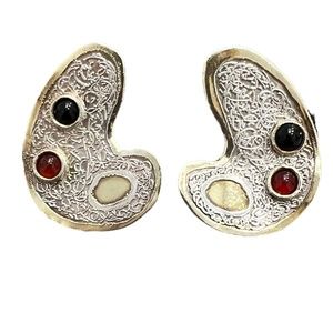 Vintage signed sterling and cabochon stone earrings. These clip on earrings are in excellent preowned condition. The earrings feature a silver design in the main area with a gold stone inset and gold stone edges. There are 2 cabochon stones in each earring. One is black and the other is amber colored. I don't know what they are. I also have a brooch from the same company with a black cabochon and similar scrollwork. Approximately 1.5"L x 1.25"W