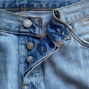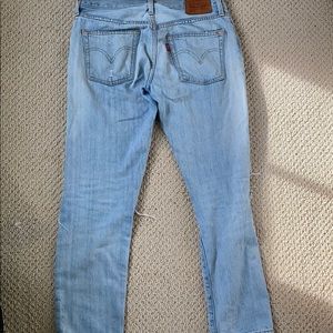 Vintage Levi 501 jeans. Heavily distressed front, perfectly worn light wash finish. Inseam is 27’’ front rise is 9’’ waist is 15’’ Would probably best fit a 29/30.