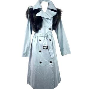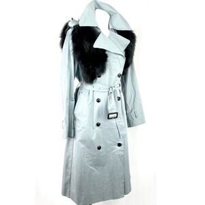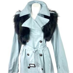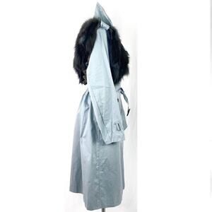 VINTAGE LIGHT BLUE BELTED LONG TRENCH WITH BLACK LONG HAIR FOX FUR MANTLE