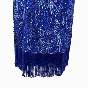 VINTAGE LILLIE RUBIN BLUE SEQUIN BEADED FRINGE FLAPPER COCKTAIL DRESS - M