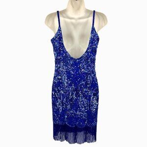 A true vintage stunner! Gorgeous blue beaded and sequin cocktail dress with a flapper style and beaded fringe bottom. Excellent condition! 100% silk. Lining 100% acetate. Bra pads stitched in, spaghetti straps, plunged back, zipper/hook & eye back closure. Color(s) may vary slightly in pictures but are as close as possible.