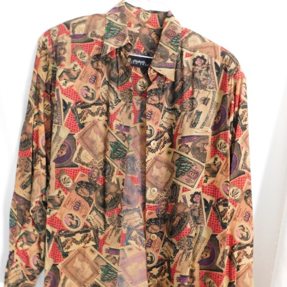 VINTAGE LINDA ALLARD ELLEN TRACY SILK BLOUSE MONETARY PRINT SIZE 2 PLUS SIZE