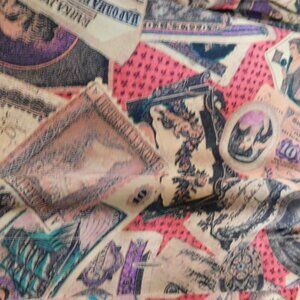 Pre-owned in nice condition, LINDA ALLARD ELLEN TRACY SILK BLOUSE MONETARY PRINT SIZE 2 PLUS SIZE