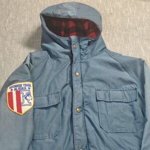 Jacket has a couple sewing repairs as well as an Ididarod Trail Alaska patch hand sewn on the sleeve