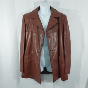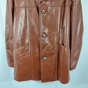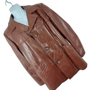 A fabulous vintage find, from London Fog! In rich pecan brown, this coat, jacket features luxe genuine leather, and a zip out plush thermal lining! The lining beyond that is a matching poly satin! Western style tailoring, shoulder pads, front pockets! Size 42R, Excellent Condition, with one Note,: the left inside satin lining at the underarm has been extensively repaired, and deep inside the sleeve there are rips in the lining- plz see pix, and there is one area with an ink mark, 1/2"- thus the super low price! Otherwise: Superb Vintage Condition!