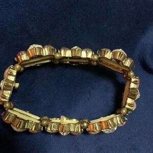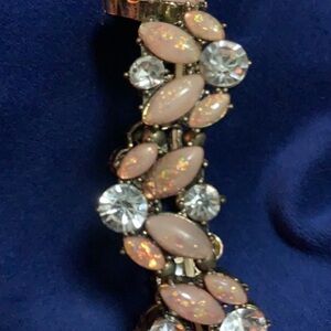 This stretchy bracelet is set with diamondesque pieces and pink tone stones that are opalescent