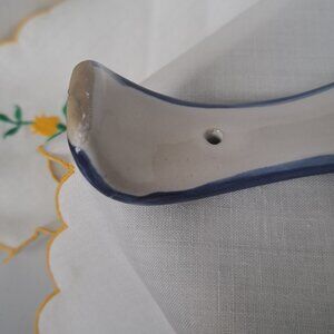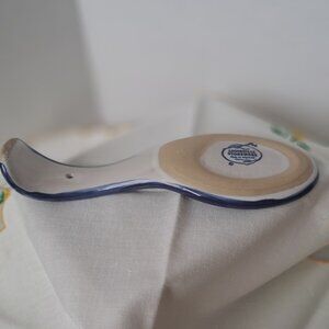 * #403 * Noah's Ark Spoon Rest * Blue rim with Noah, two giraffes, two elephants, two sheep on the ark * The spoon rest has a top hole to hang on a wall or rest on a counter * The back on the top handle has some wear. Excellent Used Condition
