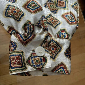 Vintage off-white patterned silk-like long sleeve blouse, back one- button closure, side small slits, size 12, no visible flaws