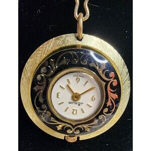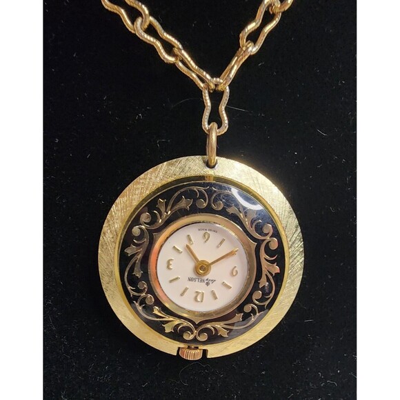VINTAGE Lady Nelson Pendant WATCH Women GoldTone & Black with Necklace Chain Manual Wind VGUC...