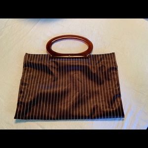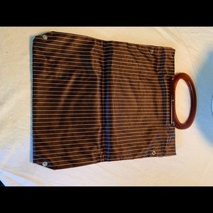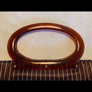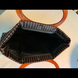 60’s charm. Convertible bag. Snap for smaller size and unsnap for a roomier tote. Lucite handles. Minor marks on handles. Satin brown with cream pinstripes. Good condition. Wear on top corner...see pic
