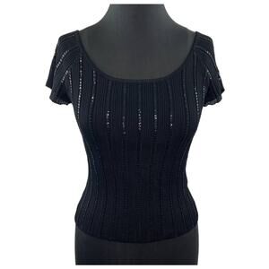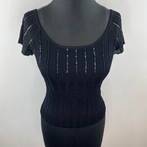 VINTAGE Laundry Shelli Segal Black Short Sleeve Mesh Overlay Sequin Stripe Top L