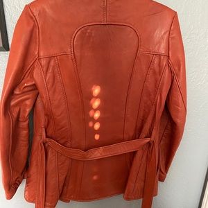 1970s Rust colored super soft leather jacket. Feels like butter! Women’s size 9, fits like a current size 8. Buttons up, with a leather tie around the waist. Two small tears in the leather, one slightly larger one. See pictures.