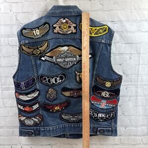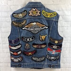 This product is a vintage Levi's men's XL denim trucker vest, featuring a classic 80s-90s style with a biker theme. Made in the USA, the vest is crafted from solid blue cotton denim with a sleeveless design and button closure. The regular fit and size make it a versatile piece that can be worn with a variety of outfits, embodying the rugged Western cowboy aesthetic of the era. Perfect for fans of Harley Davidson or anyone looking to add a unique vintage touch to their wardrobe. There are some signs of wear. One patch isn’t sewn on yet. It will be in the front pocket.