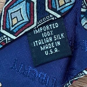 Great pre-owned condition. Vintage Liberty of London. 100% silk, made in the USA. Features a geometric print in hues of blue, red, and yellow. Measures 4" wide x 54" long.