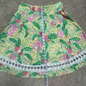 Gentle used vintage condition with no rips, stains or flaws. Beautiful skirt with eyelet trim and classic Lilly colors of pink and green. Zippered back, lined. Material has no stretch.