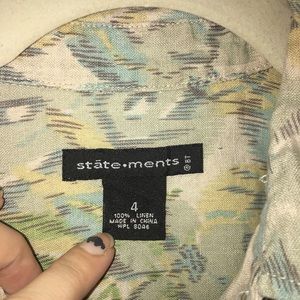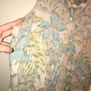 Great condition VINTAGE collared sleeveless button down shirt that is 100% linen with a fun tropical blue and green floral pattern. Shirt has built in darts. Tag says size 4 it would definitely fit a small.