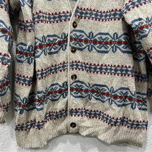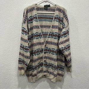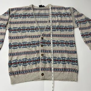 VINTAGE Liz Claiborne Lizwear button front Cardigan in a heather oatmeal color with great fall colored pattern. Missing a button shown in the picture. Size Medium