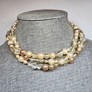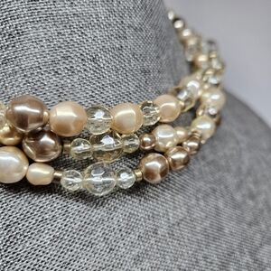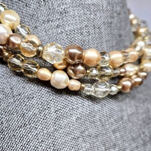 Vintage beaded necklace by Liz Claiborne. Mixed beads in gold shades and clear. Designer mark hangtag on chain. Measures about 16-18" with adjustable back. Excellent condition and smoke-free home.