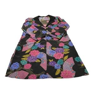 Vintage Beautiful long Maggie Sweet floral blazer with slits on both sides with shoulder pads. The colors on this blazer is very vibrant with pink purples turquoise black blues, cold greens just a beautiful piece to pair with black slacks. Jeans with a T-shirt on underneath boots regular shoes absolutely stunning one of a kind piece for your closet. Very loose and free leaf flowing blazer.