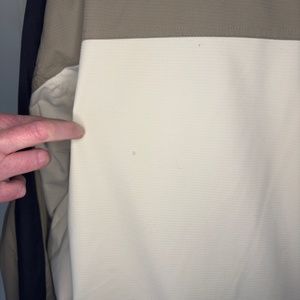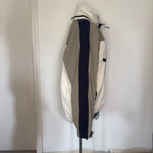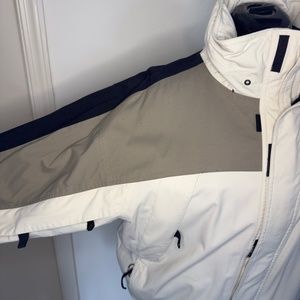 Color-block snowboard/ski jacket. Mesh-lined, with removable powder skirt. 7 pockets. Detachable hood. Armpit vents. Fleece-lined collar. Elastic, cinched hem.