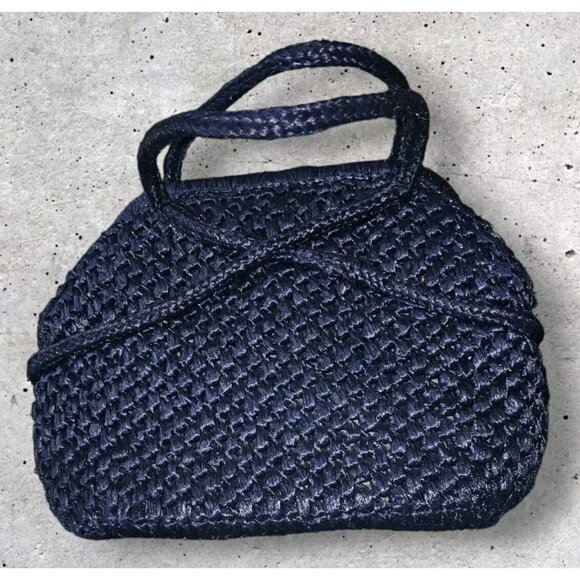VINTAGE MANTESSA BLUE STRAW HINGED PURSE Hand Mase In JAPAN